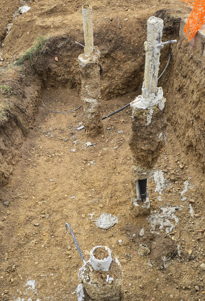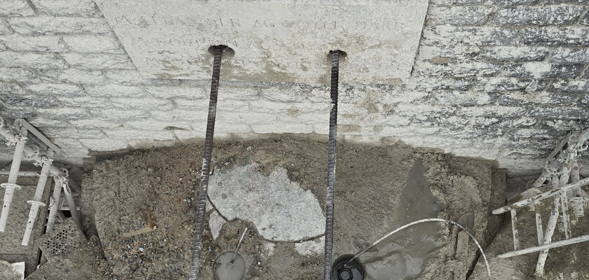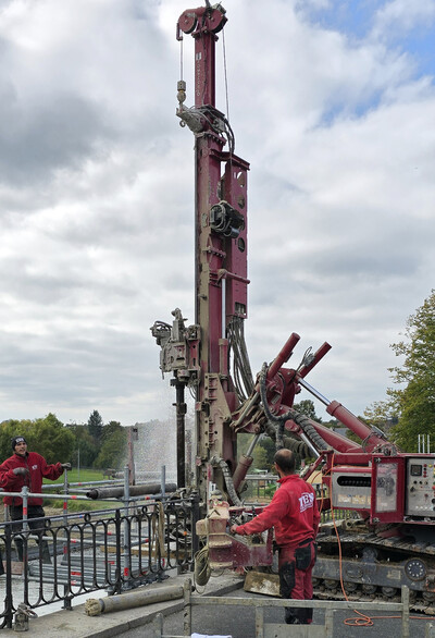 Le forage à l’air comprimé est réalisé à travers des carottages préalables, permettant de traverser les piles sans les endommager et d’atteindre les terrains de fondation calcaires.