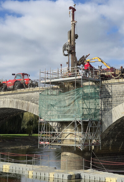 Une intervention technique sur un pont de la Sarthe, où TES Technifor met en œuvre son expertise en forage de micropieux pour la création d’une passerelle piétonne.